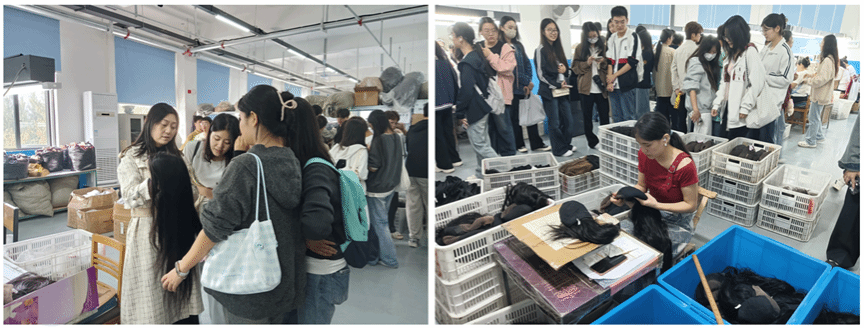 在许昌华彩发制品有限公司,学生们近距离观察假发从原材料筛选、手工钩织到成品包装的全流程,车间内,工人们熟练的编织技艺让学生们惊叹不已,技术员现场讲解了假发制作的工艺细节,强调了品质控制对跨境电商的重要性。在许昌龙熠美发饰品有限公司,公司聚焦跨境电商实战运营,企业负责人通过个人成长经历和案例分析,展示了如何通过独立站、亚马逊、Tiktok等平台将许昌假发销往全球,并就选品策略、跨境电商岗位等与学生进行了深入互动交流。