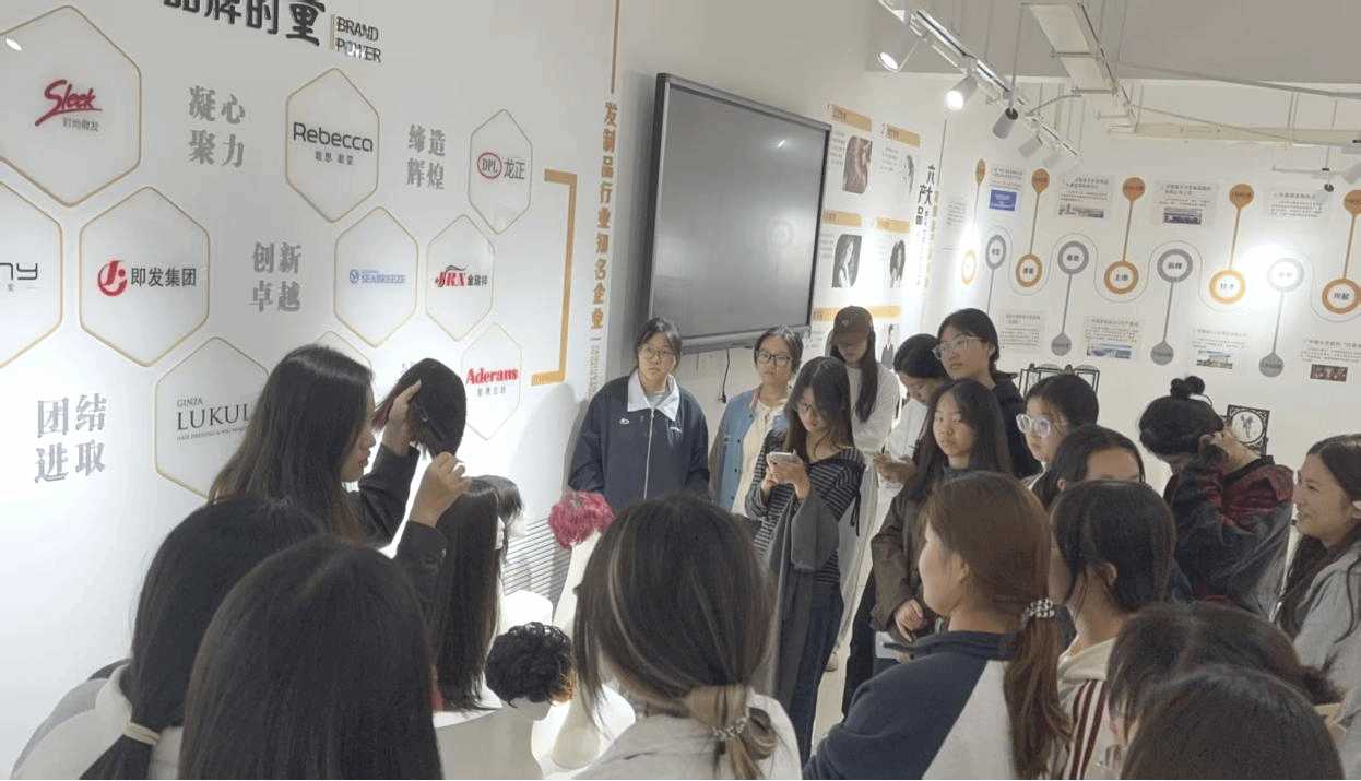 在发制品展厅,同学们认真聆听讲解,系统了解发制品的历史渊源、文化内涵及现代化生产工艺。从传统工艺发绣,到多种工艺的新型发饰,展厅内每一件产品都反映出行业在科技与个性化定制方面的最新发展,吸引了同学们的浓厚兴趣。