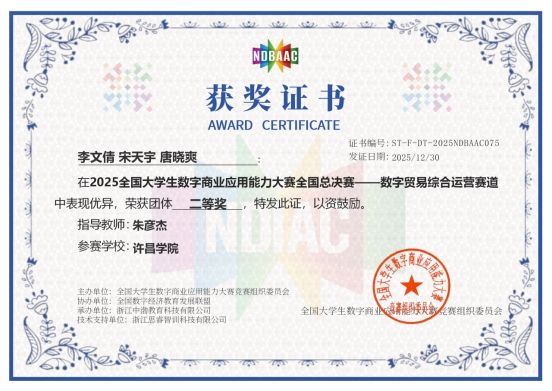 2025年12月27日至28日,2025全国大学生数字商业应用能力大赛全国总决赛在云端成功举办。我院学生团队杨紫豪、张迪、石莹荣获数字经济分析决策赛道团体特等奖,指导老师朱彦杰获得最佳指导老师,许昌学院荣获最佳组织奖。在数字贸易综合运营赛道决赛中,学生团队李文倩、宋天宇、唐晓爽荣获团体二等奖;学生团队库尔涵、李聪、李新锐和学生团队向雯雯、王思彤、邵玉花分别荣获团体优秀奖。