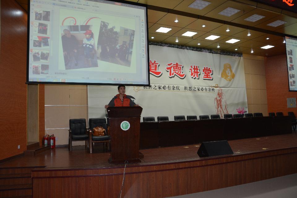 下午4:30,活动正式开始。道德大讲堂分为五个环节:唱一首歌曲、分享一段故事、诵一段经典、谈一番感悟、送一份爱心。在唐婧老师的主持下,第一个环节在悠扬的音乐声中拉开帷幕,我院师生全体起立合唱《感恩的心》。在感人的歌声中,活动进入第二个环节“分享一段故事”,我院四位优秀志愿者服务代表依次上台发言,以自己的志愿服务经历发表对志愿服务的看法,并号召大家积极参与志愿者活动,服务社会。在互动环节中,主持人在现场邀请了两位同学分别上台分享自己的道德感想,整个会场笼罩在温馨、和谐的氛围中。接着,王旭光老师亲自上台发言,为同学们讲述关于大学生如何培养责任心的方法。王老师诚挚的话语和对大家的殷切希望使大家受益匪浅,获得现场热烈掌声。