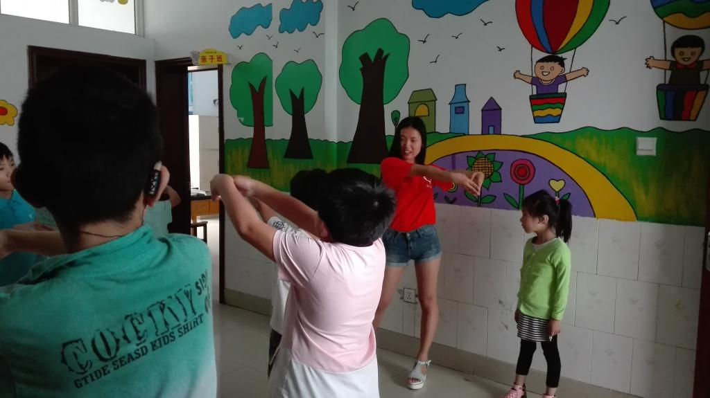 7月8日,许昌学院商学院编外雷锋连暑期赴残联社会实践队的队员们在残联教孩子们练习儿童版舞蹈《青春修炼手册》,以此来丰富孩子们的课堂。