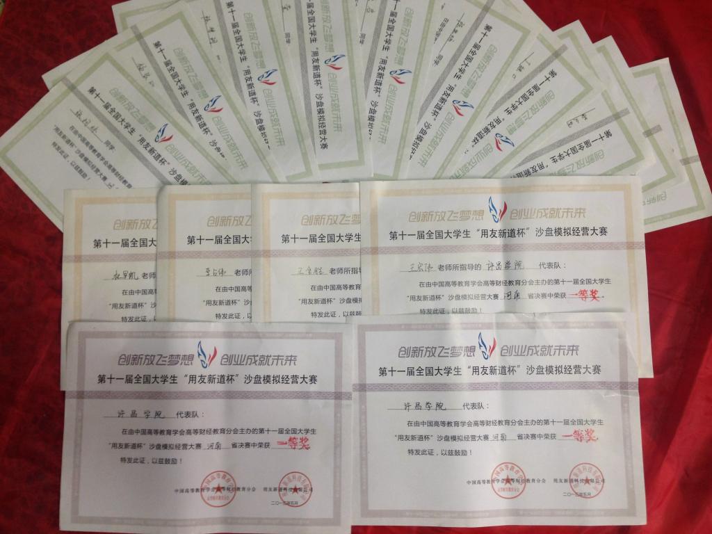 5月9日第十一届全国大学生“用友新道杯”沙盘模拟大赛在黄淮学院创新楼拉开帷幕。由商学院李占伟等三名老师及五名同学组成的“许昌学院”代表队在本次大赛中获得“用友新道杯”沙盘模拟经管大赛河南省决赛第一名。