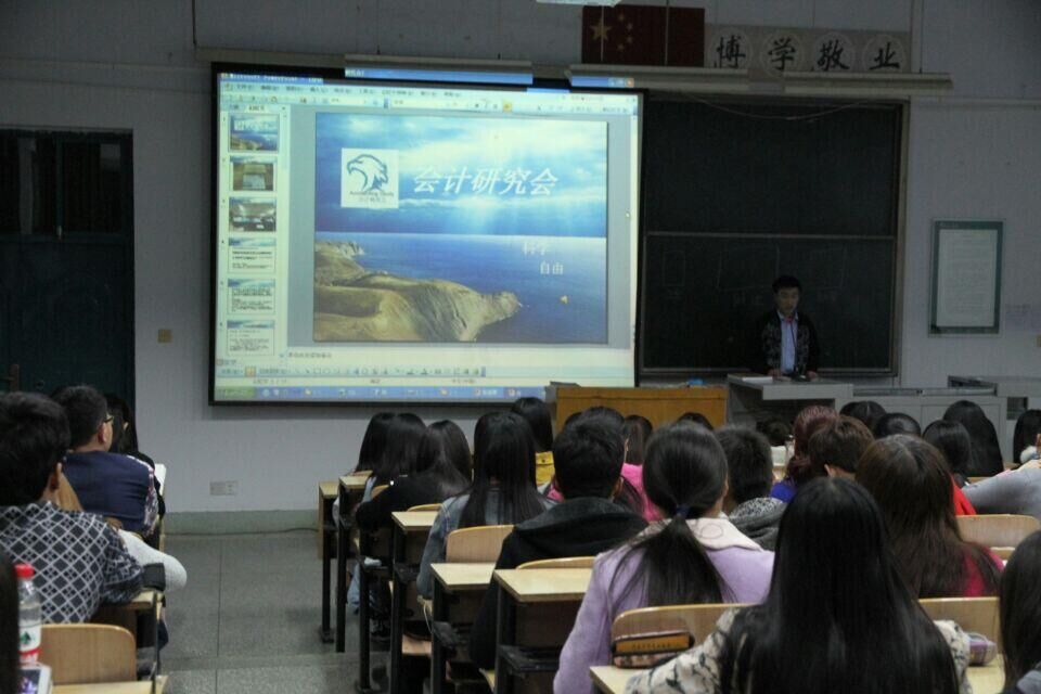 会议上,张俊松博士首先进行了简单的自我介绍,接着,张博士介绍了会计研究会的概况,该会计研究会成立于2012年,在创立初期就获得了省级优秀社团的荣誉,并成功举办了第一届会计知识大奖赛。张博士表示,会计研究会的宗旨是研学弘治,正是这种精神激励着大家,无私的为会计研究会奉献着自己的力量。随后该会计研究所前任会长申勇峰讲话,申会长结合ppt为大家讲述了前届会计研究所的种种趣事,幽默风趣的语言赢得同学们阵阵掌声,现场气氛十分活跃。申会长还与同学们交流他加入会计研究会后的改变,并鼓励同学们树立正确的大学观,生活观,让自己的青春不迷茫,让自己的青春更精彩。会议结束后不少同学也表示出了他们对该会计研究会的兴趣,并纷纷表示愿意加入会计研究会,让大学生活多一分充实。