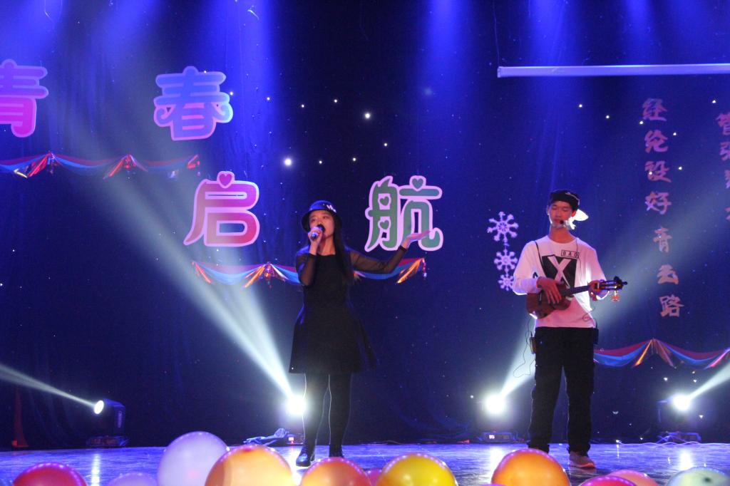 晚会开始前,人扮玩偶在全场分发各色荧光棒,星光点点中全场观众热情高涨。伴随着聚光灯的光影,校园乐队极具感染力的歌舞拉开了晚会的帷幕。晚会节目丰富多彩,其中歌曲《海阔天空》点燃了全场气氛,引起阵阵掌声,鼓励同学们无论学习生活中遇到困难与嘲笑,都要坚持自我;《皇上选秀》这一带有穿越色彩的节目,更是以其独特的思维,夸张大胆的表演,逗得台下观众捧腹大笑;民族舞《玉生烟》则在舞者曼妙的身姿中,将全场的氛围营造的如梦如幻,使得台下观众沉醉其中。整场晚会精彩不断,台上台下相互配合,场内场外微博互动,选出幸运嘉宾分发小礼品,使得观众自愿积极参与晚会互动环节。最后,此次晚会在15财注全班同学的《我相信》大合唱中画上圆满的句号。