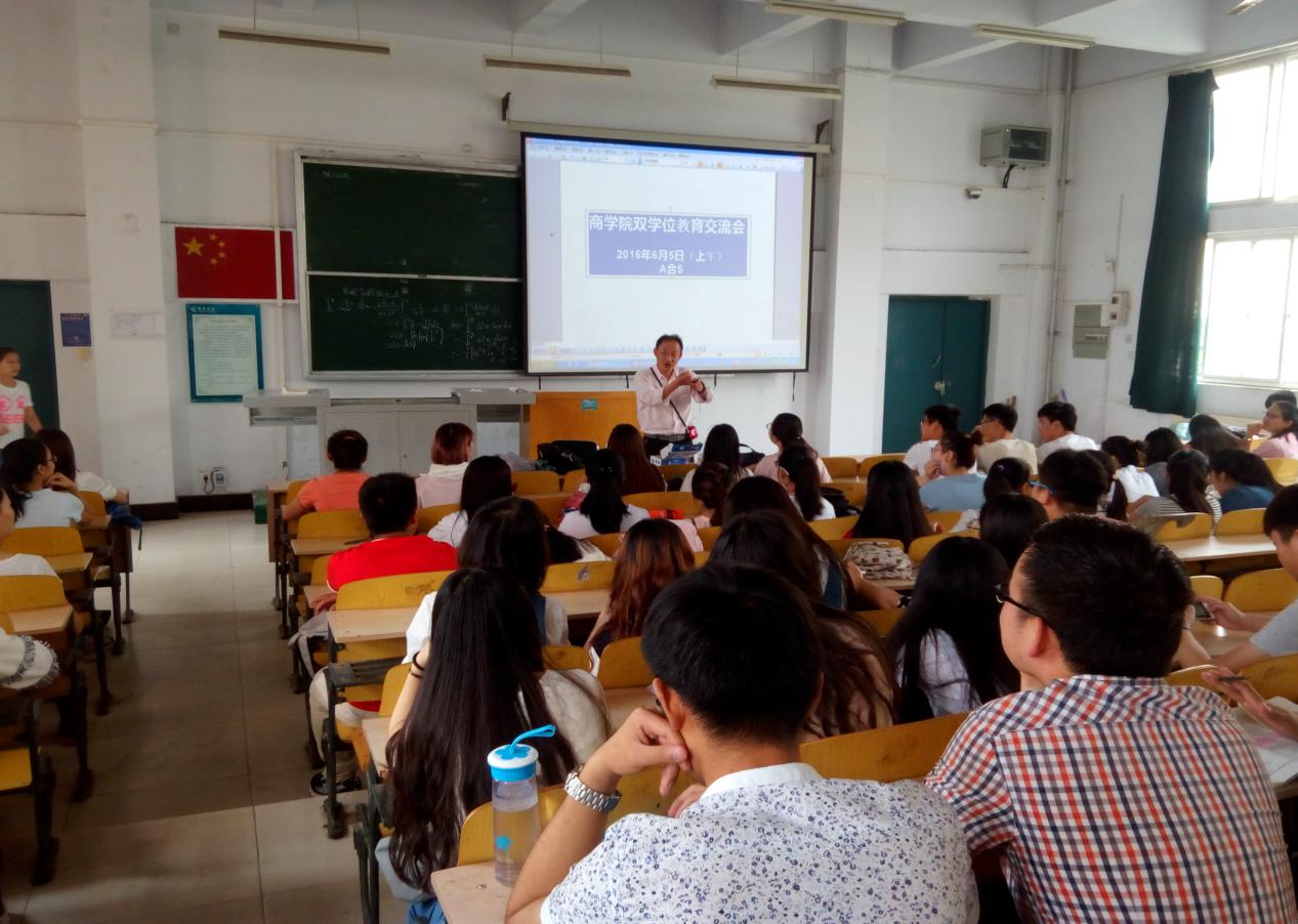2016年6月5日上午9点30分,商学院双学位班级在A合五教室举行了首次双学位教育交流会,本次交流会由商学院双学位办公室负责人张峻松老师主持,参会人员除了个别院因需要采集照片的未到学生外,商学院双学位学生110人到会。