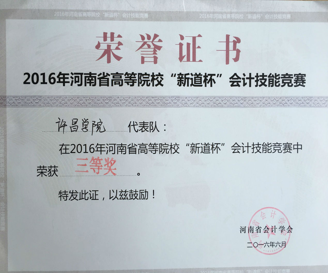 商学院派出由15级财务管理和工商管理(会计方向)专业的段居伟、郭荣、张华允、李东茹四位同学组成的“许院一队”,邵帅、王利娟、李杰、李志鸿四位同学组成的“许院二队”参赛,江雪、刘娟娟老师担任领队。比赛期间,2支队伍运用扎实的会计理论知识,团结合作,精心布局,经过会计手工技能竞赛和会计信息化竞赛两场比赛,激励角逐,最终两支队伍均获得河南省省赛三等奖。