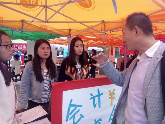在招新期间,会计研究会指导老师张峻松在招新期间也不时地到达现场了解情况,指导招新工作,给负责招新的学生送去温暖和鼓励。