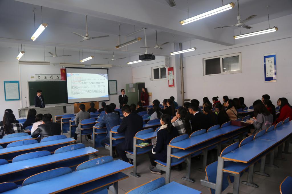模拟招聘会分为模拟招聘宣讲会和公司面试两部分。12日上午8:40,模拟招聘宣讲会在C楼406教室召开,宣讲会由恒大集团宣讲人赵金宝、三只松鼠公司宣讲人段坤坤和巨人教育集团宣讲人李艳朋分别主持。在宣讲会期间,三个公司分别对各自公司的发展历程、企业文化、薪资福利和待遇、招聘岗位及其任职要求向同学们作了介绍,在介绍之后又对同学们进行了答疑解惑,最后又进行了投递简历和填写报名表,参与应聘者根据个人优势投简历至相应公司,通过资格审查则进入相应公司的应聘环节。