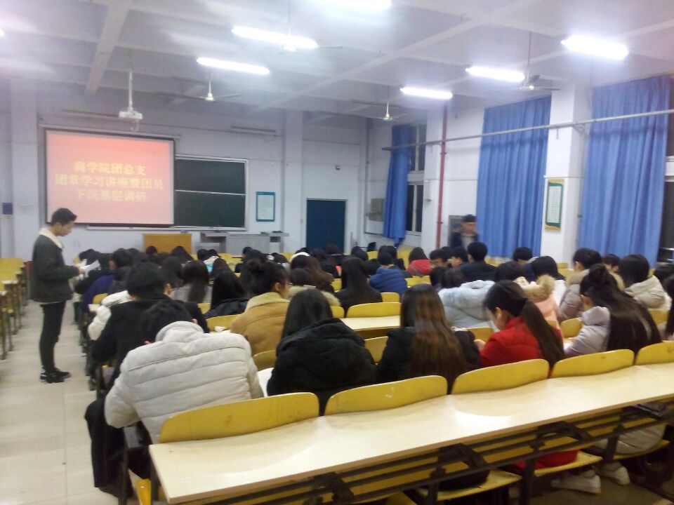 近期,商学院与体育学院合作,继续一同跟进团干下沉基层活动。12月11日晚,在A合四教室召开了青年团员调研暨与青年团员共同学习团章讲座,体育学院团总支书记陈丹做了题为《与青年团员一起学习团章》的演讲,并带领同学们一起观看相关视频,我院15级人力资源管理1、2班,工商管理(注册会计师方向)三个班一百多名青年团员共同学习团章。讲座结束后,陈书记组织我院同学们填写了创新创业调研报告和团情调研报告。