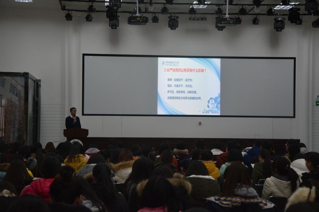 2016年12月14日14时,我院在创新创业学院培训中心举办了主题为“新常态下公务员职业发展走向”的报告,特邀中南财经政法大学庞明礼教授为主讲老师,商学院副院长王丽辉出席并主持了此次讲座,我院共计二百多名学生到场参加。