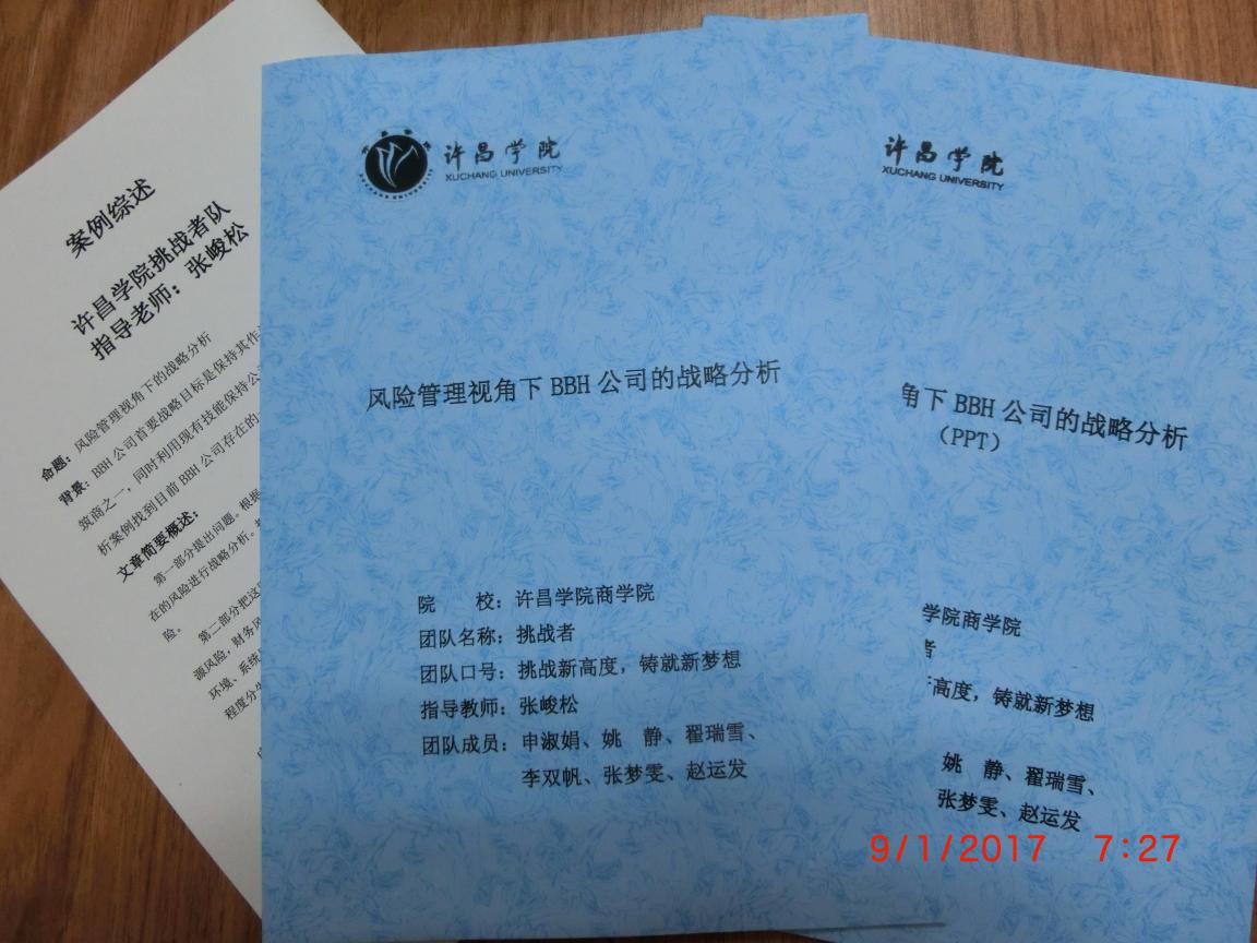 经过大赛组委会选拔,有20支队进入半决赛,许昌学院商学院挑战者队以“风险管理视角下BBH公司的战略分析”为题目的报告进入半决赛。12月24日上午通过分组选拔,挑战者队入围决赛。入围决赛队伍有9支,分别是许昌学院、河南财经政法大学、郑州航空工业管理学院、郑州大学、中原工学院、河南大学、武汉学院等。
