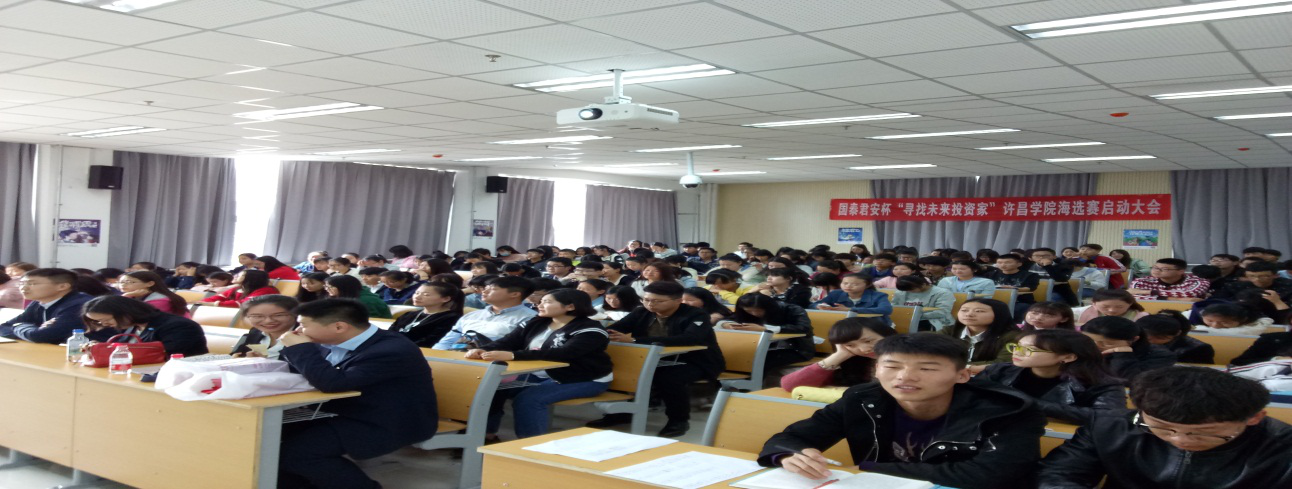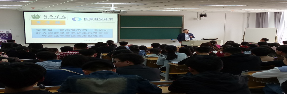为培养大学生理财观念,锻炼心理承受能力。2017年4月7日14时20分,我院在文综楼E-309举办了第三届“国泰君安杯”模拟炒股大赛颁奖暨“寻找未来投资家”许昌学院海选赛启动仪式。商学院党总支副书记海泳,许昌国泰君安公司的张广庆总经理,国泰君安河南分公司的邢子昂老师以及相关工作人员出席此次仪式,商学院200多人参与该仪式。