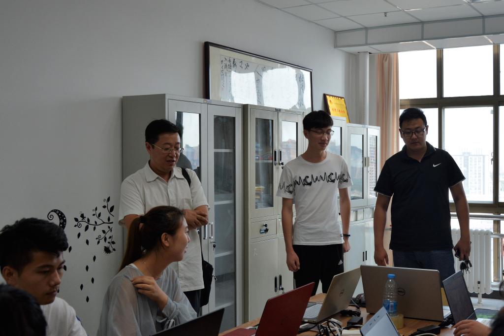最后,领导视察小组一行人来到了文科综合楼1313办公室,走访慰问了镇守我院实践工作大后方根据地的新闻宣传队的队员们。海书记对实践活动开展以来队员们的默默付出表示了充分的肯定和由衷的感谢,在对我院各个队伍暑期社会实践活动开展情况及相关宣传报道工作进行大体了解之后,就我院对内对外相关宣传工作与同学们进行了沟通与交流,他向队员们谈到,院级宣传的窗口一定要敞开,要敢于发声,更要以全新的形式,通过各种新媒体途径进行有力的发声,把商院精神传播出去,把商院形象树立起来。海书记嘱咐队员们要珍惜这次锻炼的机会,不求索取,只求奉献,做出成绩,铺好宣传工作的先路,尽最大努力为学院学子们提供一个更好的发声平台。