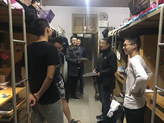 为进一步做好学校学生安全稳定工作,保障学生生命财产安全,确保学校正常的教育、教学秩序,有效防范和遏制学生安全稳定事故的发生,确保校园和谐稳定。同时也为了迎接十九大,确保十九大期间校园环境安全,2017年10月16日晚10点,14级辅导员马艺嘉老师、16级辅导员李铮老师、17级辅导员白杨老师、李盼盼老师对本院的女生宿舍进行了拉网式的突击检查,海泳副书记、张志豪老师和郭少辉老师对男生宿舍进行突击检查。