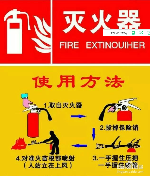 在使用灭火器时,刘教官以干粉灭火器为例介绍到,因干粉容易沉淀,在使用前首先要用力摇晃,然后用力拔掉卡住灭火器瓶压制的保险销。在使用灭火器时,一手握在瓶子上端,一手扶着前面的管子。在3米左右的距离人站上风,将灭火器前端的管口对住火源根部(也就是着火点)喷射,不要在火源上方喷射,这样的做法是无效的。