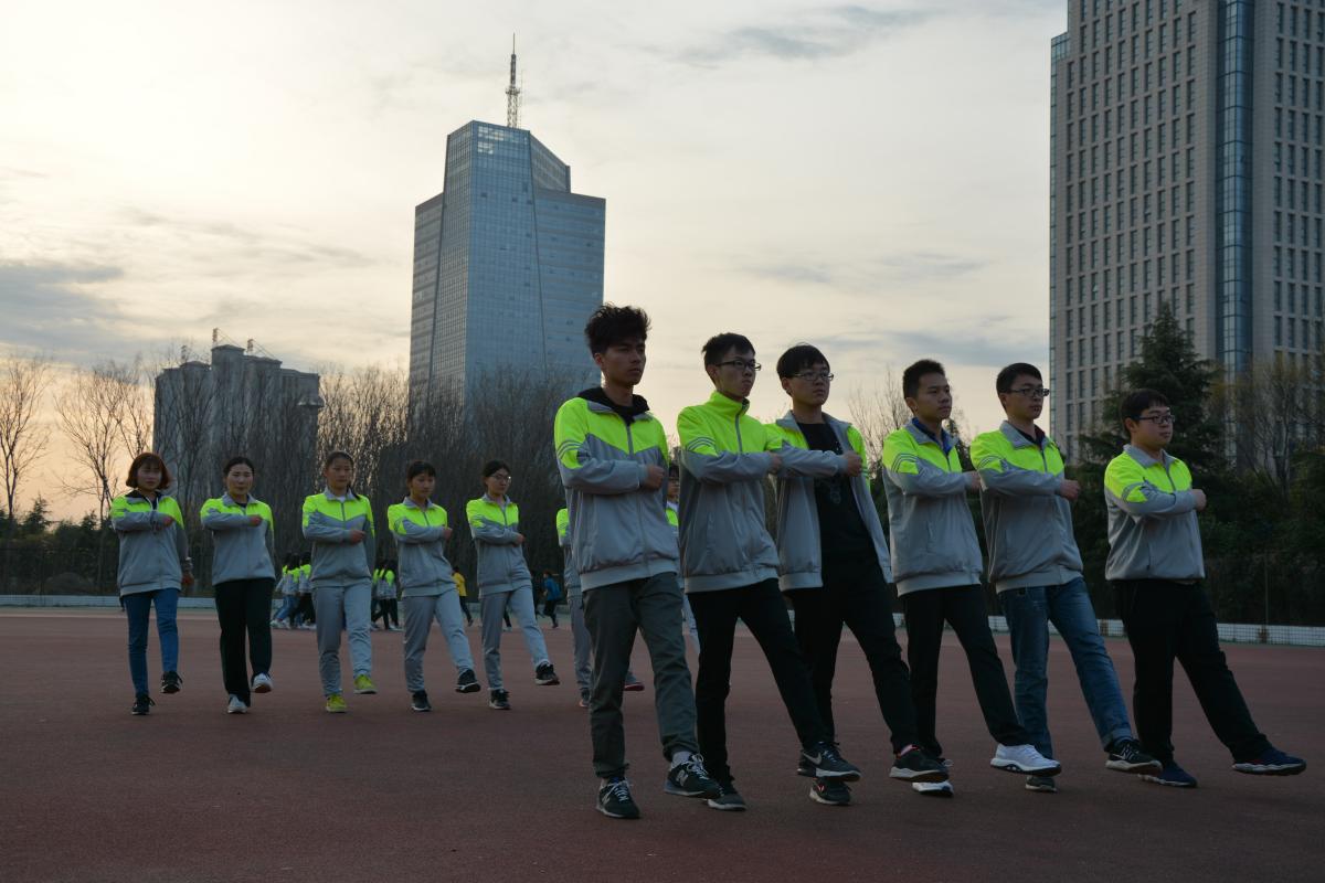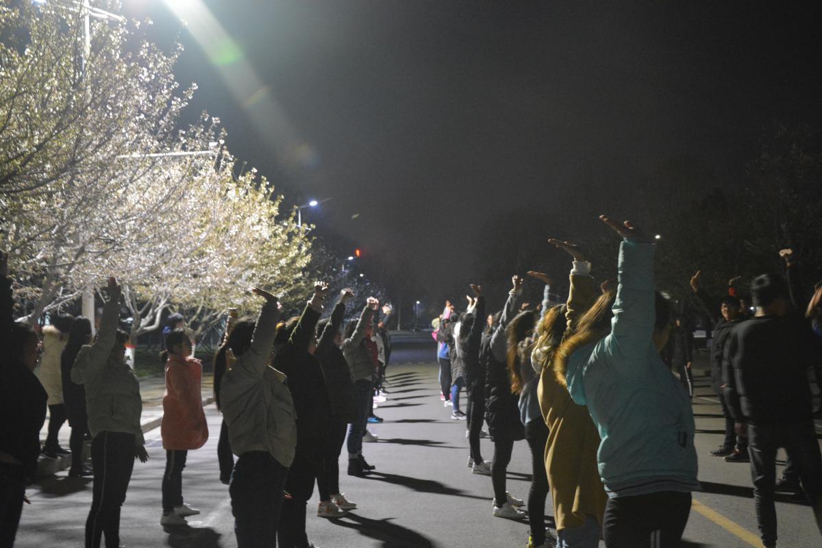 夜晚九点半,樱花大道上,白天熙熙攘攘观赏樱花的人群已然不见,出现了穿着淡青色校服的人群,踏着音乐声中的鼓点,做着整齐划一的动作,他们就是商学院的方阵和武术操列队。在训练中,为了做到动作一致,步伐整齐,他们常常要保持一个姿势不能动,虽然十分辛苦,但队员们依然十分认真,毫不松懈,力求每个动作达到完美,充分彰显了商院儿郎超越自我,顽强拼搏和团队协作的精神。