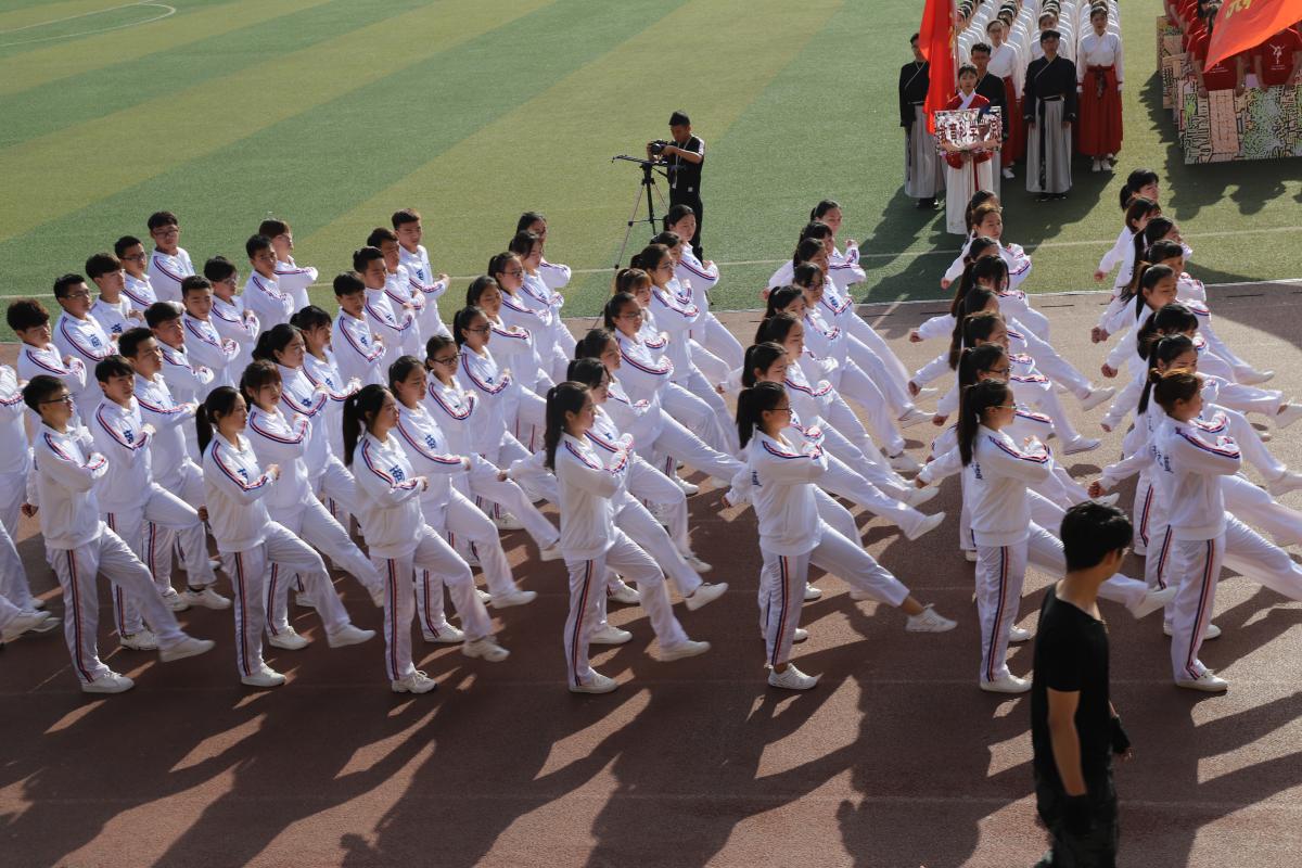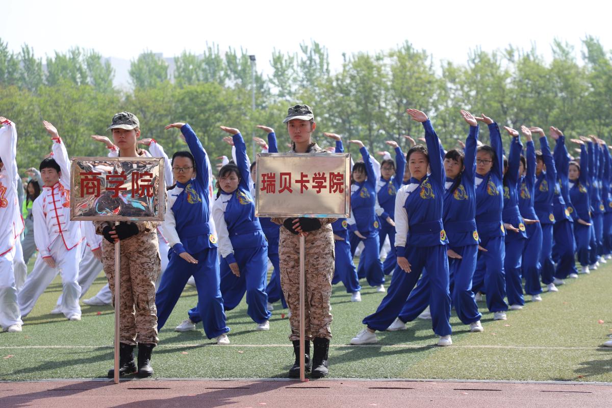 4月18号上午八点,我校第十五届田径运动会开幕式正式举行。运动员进行曲分外的嘹亮,商院的方阵队员们飒爽英姿,以饱满的精神亮相。他们热血铿锵,迈着整齐的步伐,向主席台走去。本次方阵展示,我院结合院系特色巧用珠算,队形变化过程中,队员们身着白衣分裂成算盘状。随后,方阵辅助人员身着黑衣进场,佯作算珠,两批人员完美配合拼凑成完整的算盘,手打算盘身穿红色长大褂的轮滑先生更是为此次表演再添色彩。大家一致喊出珠算口诀“一进一、二进二.....”嘹亮的口号、变化的队形充分彰显了商院儿郎热情活泼、积极向上的精神风貌。团体武术操展示过程中,商院吉娃娃们身着蓝白相间练功服,精神抖擞,动作如行云流水,连贯洒脱,浑身散发着青春的朝气展示着运动的美丽。天地炎黄、千古执商、商院儿郎、与国无疆,武术操与方阵的商院儿郎再次用实际行动展现了商院儿郎该有的精神风貌。