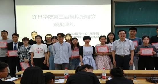本次校园模拟招聘会由许昌学院就业指导中心主办,商学院及大学生职业发展协会承办,以“展现自我风采 塑造精彩未来”为主题,吸引了全校各个院系学生前来参加。招聘会全程由商学院党总支副书记海泳策划指导,同时邀请了智联招聘许昌服务中心总经理李斌、百度锐之旗总经理宋星担任校外嘉宾评委,另由人力资源管理专业教师漆彦忠、王昭等组成校内专业评委。2018年5月26日下午18时,模拟招聘会完成所有赛程,顺利闭幕。