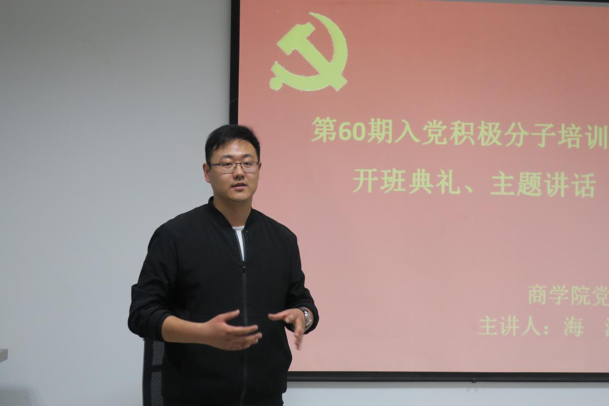 为加强对入党积极分子的培训与考核,2018年10月31日晚6点半,我院于文综楼1015教室举办第60期入党积极分子培训班开学典礼主题讲话的活动。党总支副书记海泳和团总支书记张志豪老师到场参加。