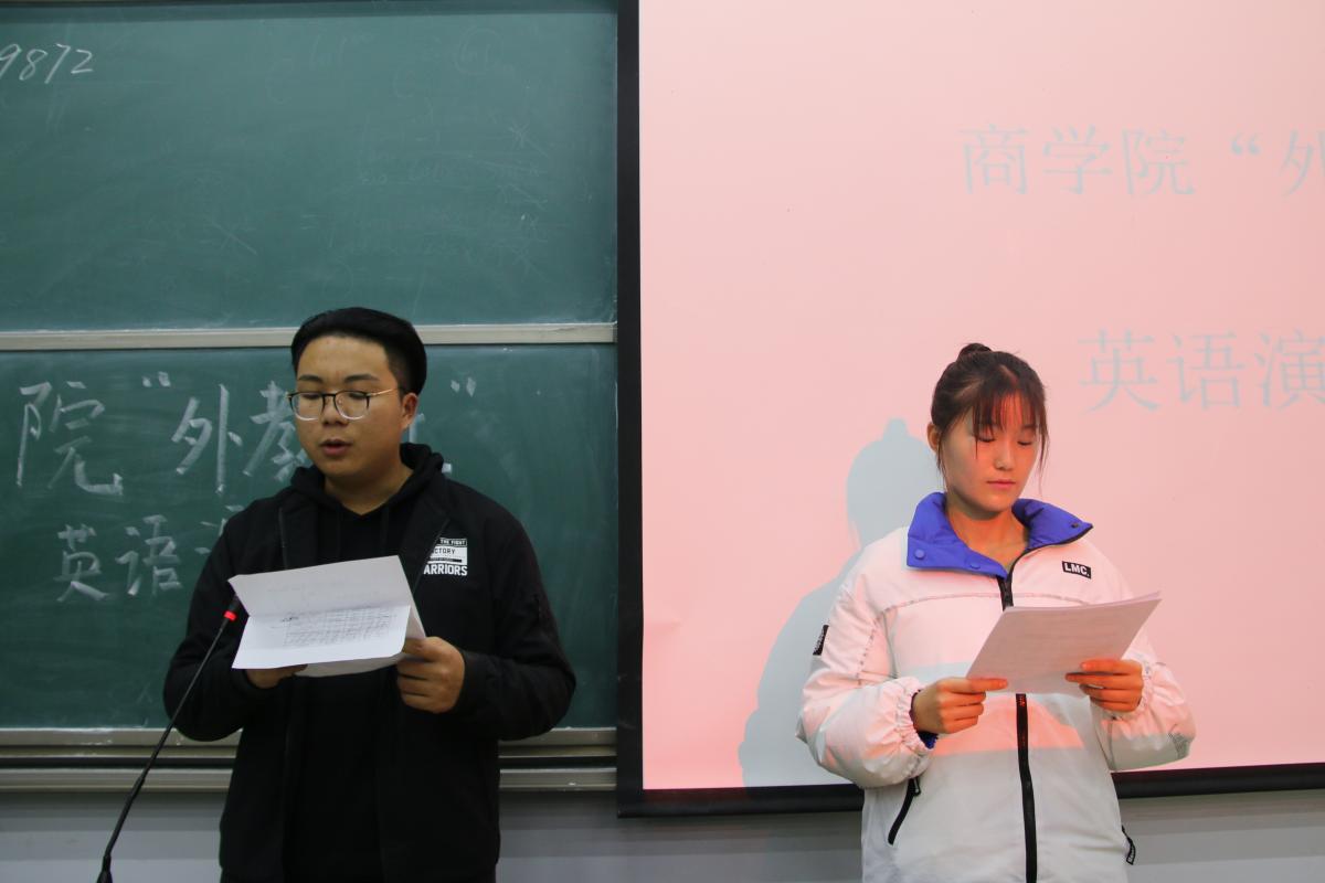为营造英语学习氛围,丰富同学们的课余生活,我院第十五届“外教社杯”英语演讲比赛于2018年11月23日晚六点三十分在蕴韬楼B合5教室举行,本次演讲比赛的评委有李艳、张红鑫、何艳、赵丹悦等人,由18级经济一班周森和18级财管一班李明闪担任大赛主持人。