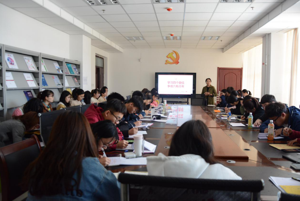 为了引导同学们正确认识时代责任和历史使命,树立正确的理想抱负。我院于2019年3月31日下午两点半在文综楼1323教室举办学习“四个自信”争做“六有青年”业余团课主题培训。本次业余团课培训由李盼盼老师主持,三十三期分团校全体成员到场参加。