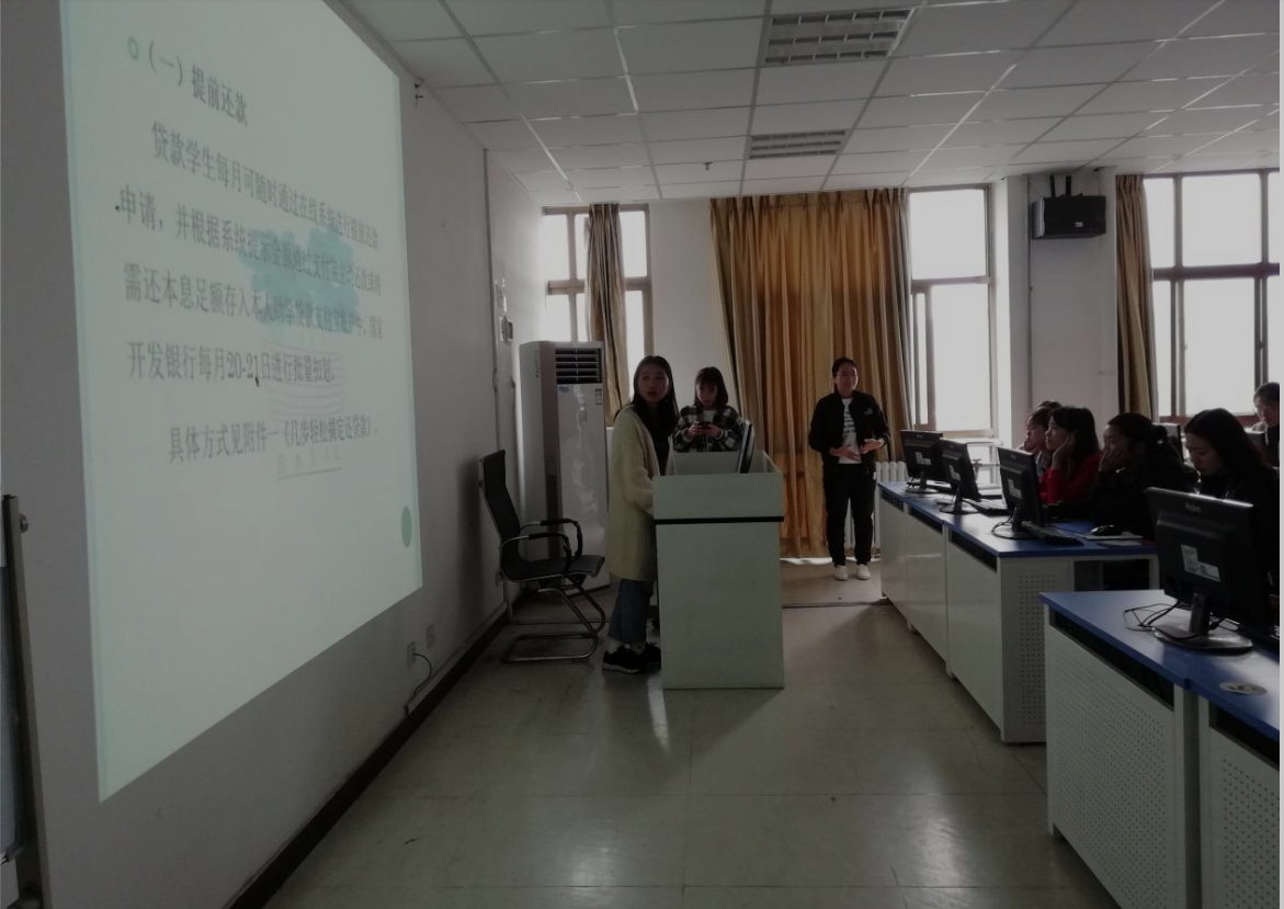 教育活动初,为大家分发了贷款还款的相关信息手册后,李盼盼老师上台发言,向大家讲述按时还贷款的重要性以及没有按时还贷款的危害,并且举了一些没有按时还款的例子做警示,希望大家都能够按时还款。之后,团总支学生会权益部部长朱凤围绕毕业确认、提前还款、注意事项三方面给在座的同学讲解,同时将学生用户登录网址告知大家,并给大家讲述忘记登录密码应如何做。经过李盼盼老师和朱凤同学的讲述,贷款毕业生都表示将会在毕业之前按时还款。