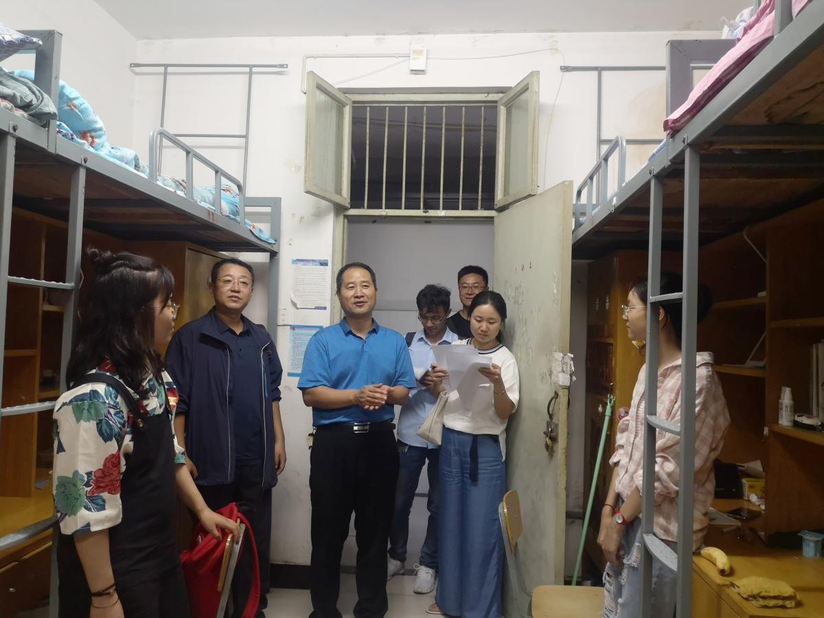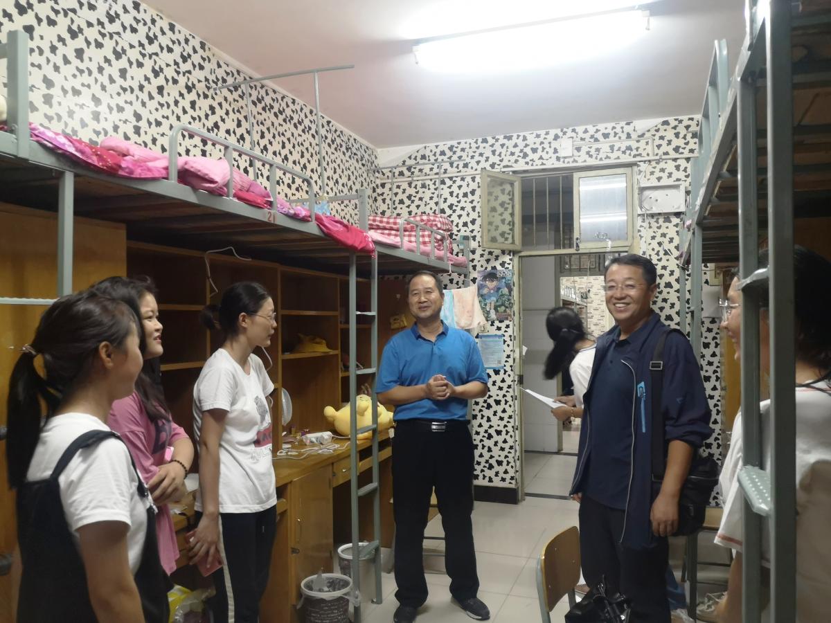伴随着迎新活动,为更全面了解我院新生寝室生活情况,使新生尽快适应大学生活,2019年9月5日晚六点半,商学院院长张铭新、商学院党总支副书记海泳、团总支负责人武梦夏、19级辅导员郭少辉老师、19级辅导员尚小税老师前往商学院学生公寓看望19级新生。