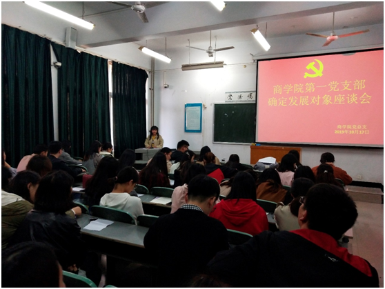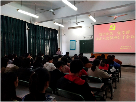 2019年10月17日,商学院学生第一党支部在C楼107教室召开了关于确定吴晶晶等22位同志为入党积极分子的会议。学生第一党支部书记孔令玲老师参加了此次会议。