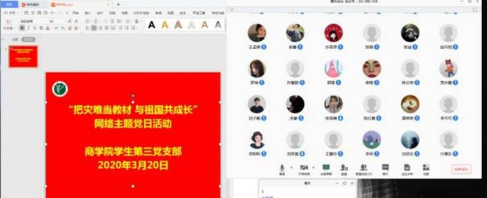 2020年3月20日下午,商学院学生第三党支部通过腾讯会议的方式,召开了“把灾难当教材,与祖国共成长”网络主题的党日活动,商学院学生第三党支部全体党员参与了本次活动。