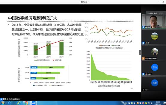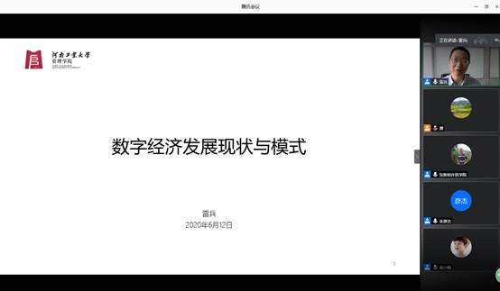 2020年06月12日(星期五)下午3:00,我院邀请河南工业大学博导雷兵教授通过腾讯会议(ID: 363 745 409),为我院师生进行一场《数字经济发展现状与模式》线上讲座。