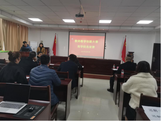 为进一步深化教学内涵建设,提升教师教学研究与创新能力,推动课堂教学范式改革,全面提高课程建设水平和应用型人才培养质量,2021年1月22日,商学院在文科综合楼1302举办教师教学创新大赛院内选拔赛。赛前根据学校要求和精神,商学院高度重视,积极鼓励老师报名,及时制定赛事日程和推优方案,根据报名情况邀请院外专家组织评审。
