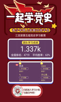 学生第三党支部:6月6日于E-1325组织了“观看《觉醒年代》 谈青年担当”党史学习教育,支部成员经常利用课余时间进行网上对战答题。