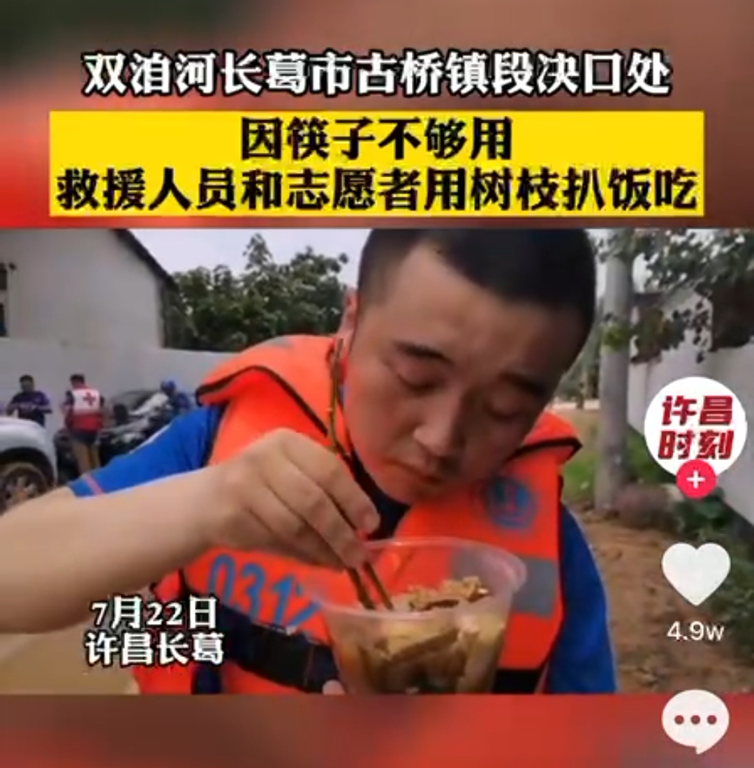 7月22日,媒体记者在双洎河长葛市古桥镇段决口处采访时抓拍到一组镜头:两位身着橙色救援服装的志愿者手托塑料简易饭碗,用树枝当筷子,快速地“解决”午餐。我校商学院党委副书记海泳在朋友圈里刷到这个视频后,一眼就认出了这个“用树枝吃饭”的人正是该院2020级市场营销专业学生王勇。