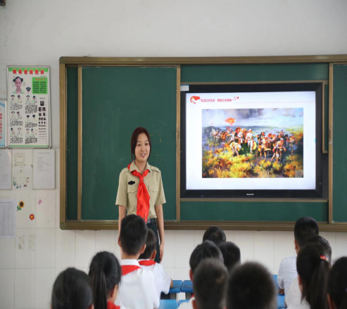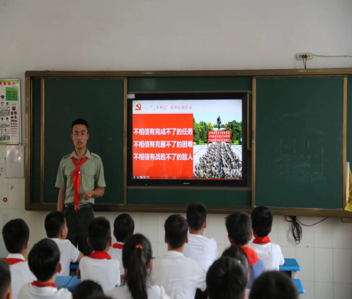 首先,社会实践队的队员们通过讲述一个个感人肺腑、发人深省的红色故事,为全体学生带来了一堂别具一格的党史课,仿佛一个个不朽的英雄人物展现在同学们眼前,让学生深刻感受到中国共产党从弱小走向富强的艰辛历程,引导学生听党话、感党恩、跟党走,立志成才,报效国家。在课堂上学生们与社会实践队队员们积极互动,整个宣讲过程生动有趣,学生们收获满满。最后,学生们用自己的方式表达了对祖国的热爱之情,表达了对党的祝福,努力争做共和国优秀的接班人。