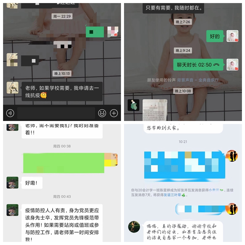 三尺讲台上,他们是教师,是传道授业解惑的学者;在抗疫前线,他们是学生的坚实后盾,是逆流而上的勇士。秉持着党员冲在第一线的精神,我院党委书记翟广辉、院长张新铭、党委副书记海泳以及青年教师、辅导员老师们毫不犹豫报名加入志愿者队伍,在关键时刻站得出、豁得出。在奔赴一场场爱心志愿里,教师志愿者们做到了24小时守护不打烊,温暖不间断。普通学生主动配合隔离,学生党员们一个个主动“请战”,请求在需要的时候第一时间安排志愿服务,一系列暖心举动不禁让老师们热泪盈眶。
