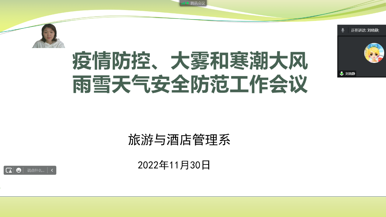 根据河南省教育厅办公室关于做好全省教育系统大雾和寒潮大风雨雪天气安全防范工作的紧急通知,11月30日上午,我院领导班子成员通过腾讯会议集中学习文件精神,部署安排学院防范工作。会议主要从提高思想认识、加强安全教育、排查整治安全隐患、强化交通安全管理等方面讨论部署工作。