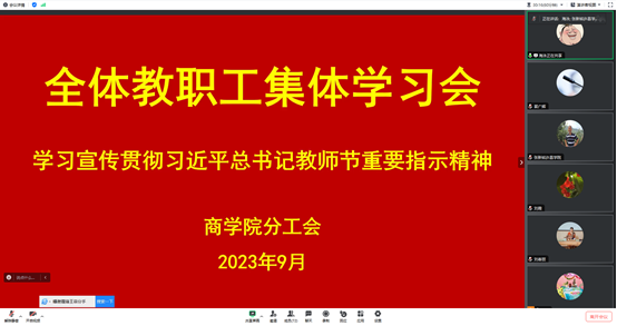 为深入学习贯彻习近平总书记教师节重要指示精神和李强总理的批示要求,9月28日晚上,我院分工会根据中国教科文卫体工会全国委员会和省教科文卫体工会委员会的《关于学习宣传贯彻习近平总书记教师节重要指示精神的通知》精神,召开线上会议,组织集体学习。