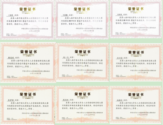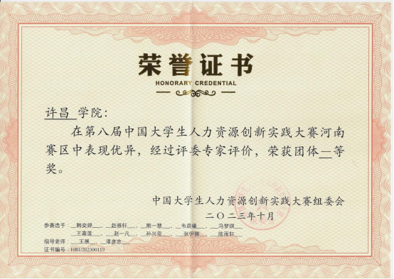 中国大学生人力资源创新实践大赛是由中国劳动关系学院主办的重要赛事,以赛促教、以赛促学、产教融合是HRU大赛的宗旨,以赛促就、校企互动是大赛为高校师生提供的服务。大赛自8月份开展以来,我校精心组织策划,积极筹备组队,共有10位同学组成一支队伍代表我校参加大赛。最终,我院王展老师、漆彦忠老师指导的实务设计、劳动争议处理、案例分析、无领导小组讨论及数字化HR五个赛道均获得河南赛区一等奖的成绩,职场实战获得二等奖的成绩。其中,商学院2021级人力资源管理专业韩奕婷、孙兴莹获得个人一等奖的成绩,陈雨轩获得个人二等奖的成绩;商学院2022级人力资源管理专业熊一慧、赵雅轩、韦晨曦获得个人一等奖的成绩;商学院2021级工商管理专业张伊娜、冯梦琪获得个人一等奖的成绩;国际教育学院2021级人力资源管理专业赵一凡、王嘉莲获得个人一等奖的成绩。许昌学院获得团队一等奖的优异成绩。