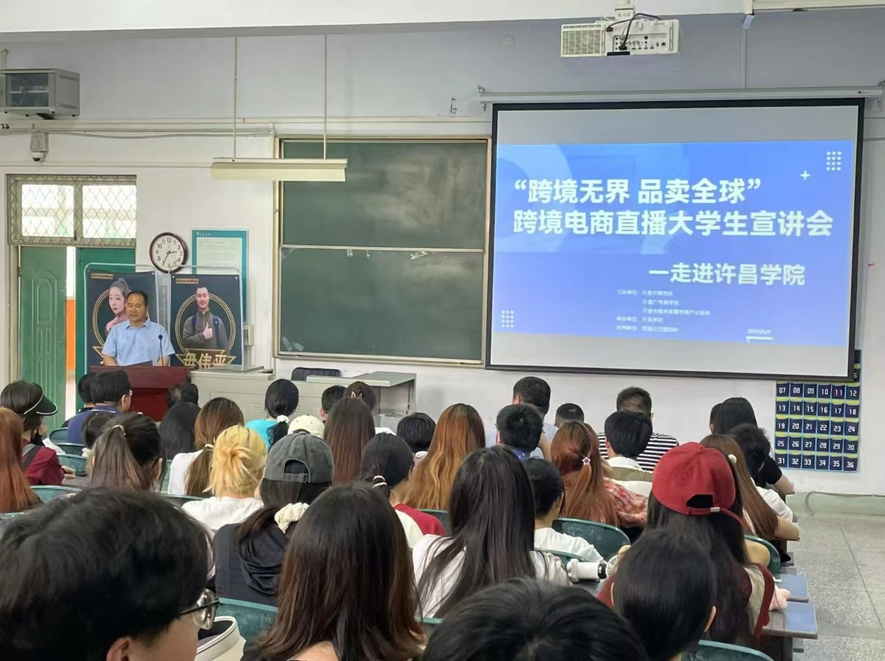 2024 年 5 月 24日,“跨境无界 品卖全球”跨境电商直播大学生宣讲会在我校A合十八教室举行。本次活动由许昌学院商学院承办,许昌市商务局、许昌广电商学苑、许昌全媒体直播电商产业基地主办,阿里巴巴国际站支持。宣讲会上,商学院院长张新铭、许昌市商务局副局长张晓刚先后进行致辞,许昌广播电视台副台长杜建伟,商学院副院长朱彦杰及电子商务专业广大师生参加本次活动。