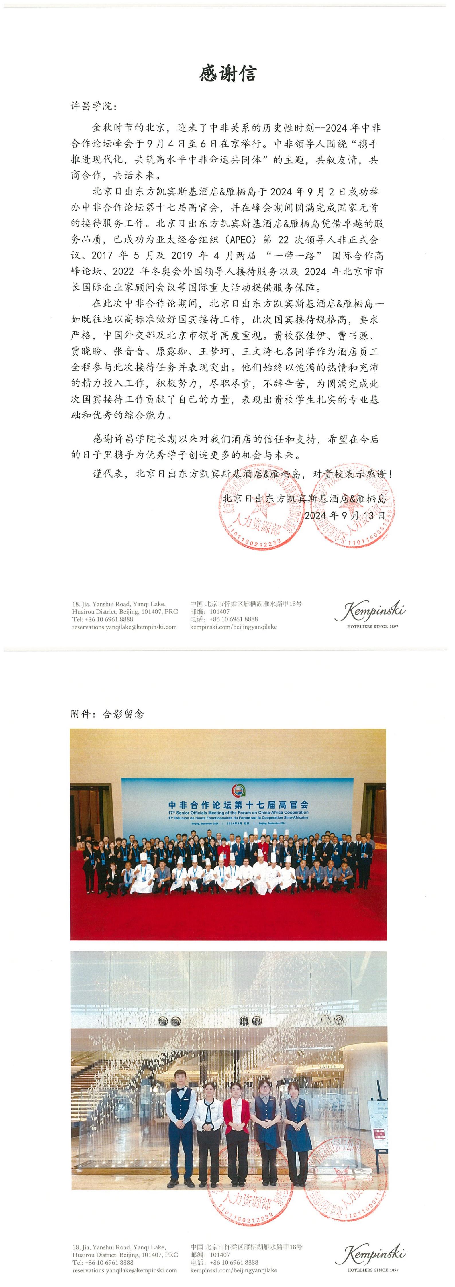 近日,中非合作论坛峰会接待单位北京日出东方凯宾斯基酒店&雁栖岛向我校发来感谢信,表彰旅游管理专业七名实习生在中非合作论坛接待期间做出的贡献。