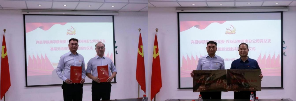 为全面贯彻落实党的二十大精神,着力提高基层党组织的凝聚力和战斗力,促进党建工作与业务深度融合,2024年10月11日下午,许昌学院商学院党委与兴业证券河南分公司党总支举办党建共建签约仪式。兴业证券河南分公司党总支委员、兴业证券许昌分公司总经理李杰等一行6人来校出席活动,许昌学院商学院党委书记王鸿政、院长张新铭等6人参加活动。此次活动由商学院党委副书记海泳主持。