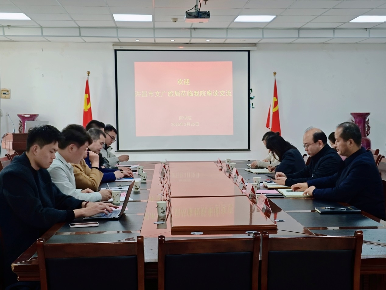2月25日下午,许昌市文化广电和旅游局副局长李彩、许昌市大胖小胖文旅负责人魏琼等一行6人到我院进行合作交流。我院在文科综合楼1302会议室举行交流座谈。院党委书记王鸿政、院长张新铭、副院长刘霞出席会议,旅游和酒店管理系师生代表参加了座谈交流。座谈会由院长张新铭主持。