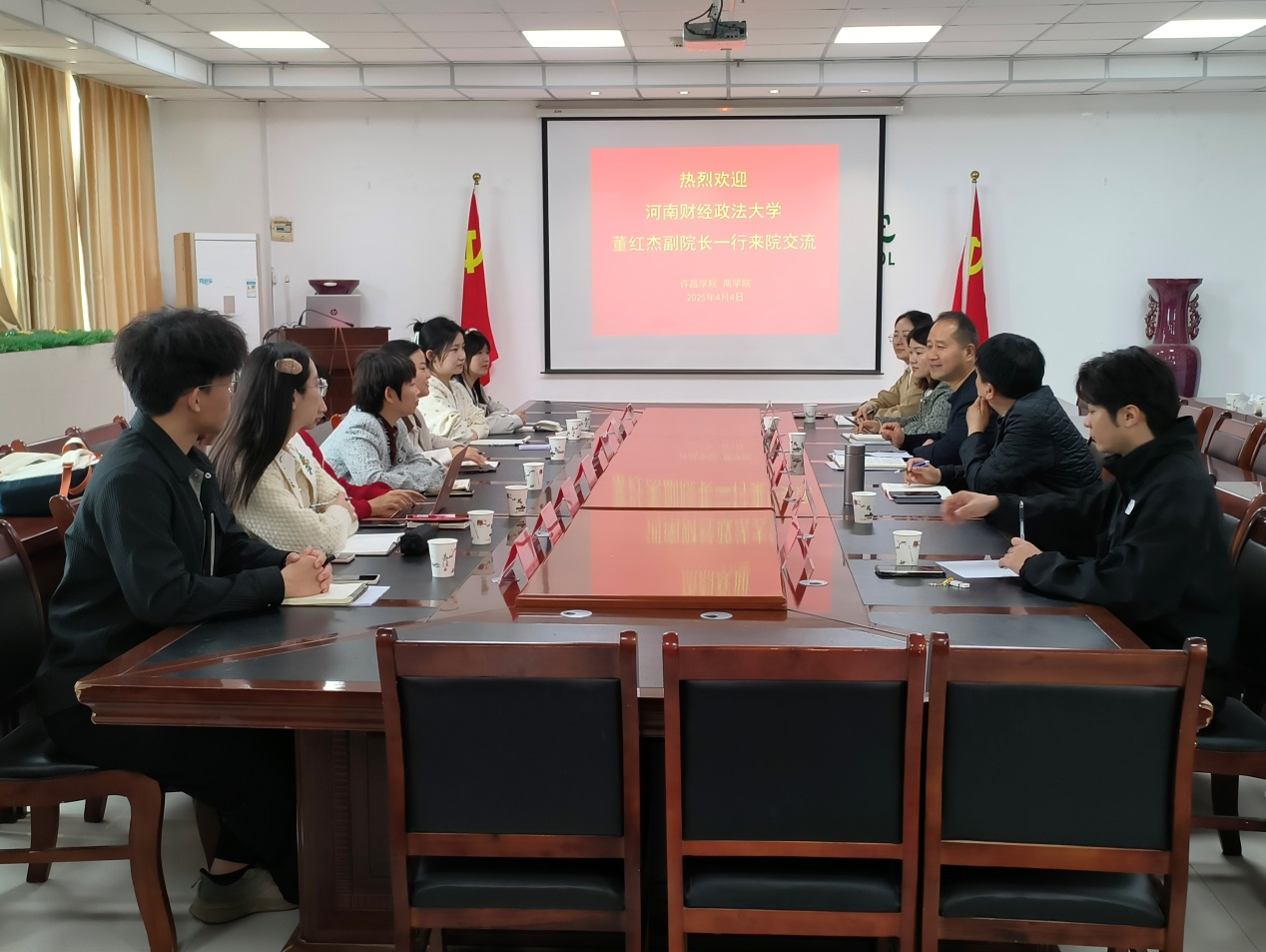 4月4日,商学院与河南财经政法大学联合举办学术交流会,围绕“胖东来成功经验”展开研讨,探索校企合作与商科教育融合路径。商学院院长张新铭、副院长刘霞、企业高管袁总、许昌文旅推荐官张军建、河南财经政法大学审计学院副院长董红杰及两校师生代表参会。