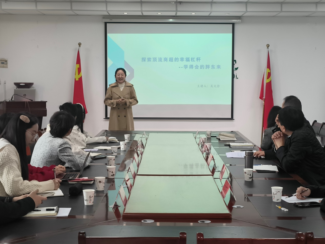 会上,张新铭院长介绍了学院在学科建设与校企合作中的实践成果。董红杰副院长分享了该校产教融合经验,强调胖东来案例对商科人才培养的借鉴意义。吴文静老师通过以“探索顶流商超的幸福杠杆”为题的报告,系统解析了胖东来以“极致的商品质量、共情服务、强执行力”构建的“幸福生态”,指出其核心在于“洞察人性需求”。王昭老师从文化视角切入,解析了胖东来“用真品换真心”的服务理念与员工价值观培养路径。