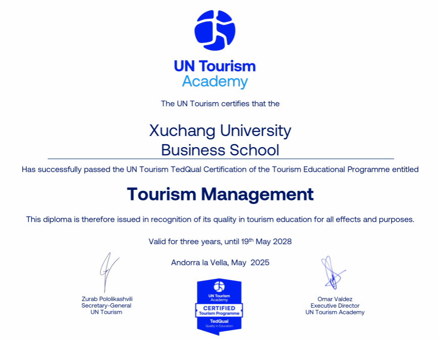 2025年5月20日,我院旅游管理专业通过联合国世界旅游组织TedQual国际认证,认证得分率90.41%,以优秀等级获得长达三年年限的国际认证(2025年5月19日至2028年5月19日)。