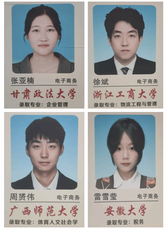 在考研赛道上,2025届电子商务专业同样成绩斐然。张亚楠、徐斌、周赟伟、雷雪莹四位同学凭借坚定的信念和顽强的毅力,分别被甘肃政法大学、浙江工商大学、广西师范大学、安徽大学等高校录取。他们的成功为学弟学妹们树立了榜样,激励着更多同学追求更高的学术目标。