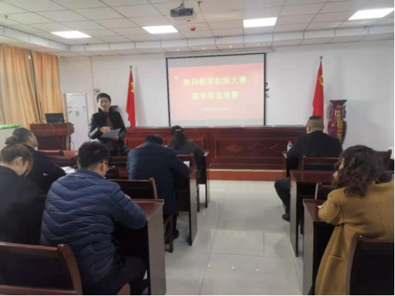 为进一步深化教学内涵建设,提升教师教学研究与创新能力,推动课堂教学范式改革,全面提高课程建设水平和应用型人才培养质量,2021年1月22日,商学院在文科综合楼1302举办教师教学创新大赛院内选拔赛。赛前根据学校要求和精神,商学院高度重视,积极鼓励老师报名,及时制定赛事日程和推优方案,根据报名情况邀请院外专家组织评审。