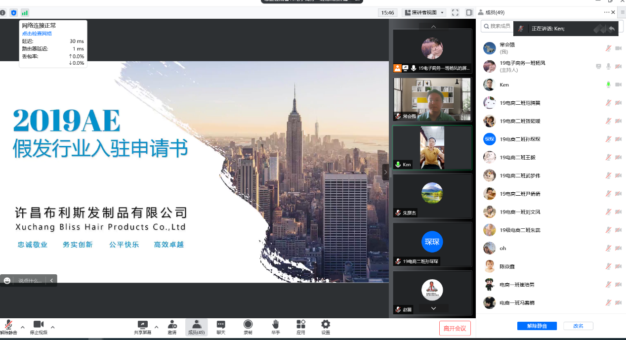 为了更好地推动我院2019级电子商务专业毕业实习及就业工作,8月17日由我院电子商务教研室联系许昌当地优秀电商企业(摩登秀发制品有限公司、龙生源商贸有限公司、布利斯发制品有限公司、瑞宇商贸有限公司、玖豪盈商贸有限公司、华彩商贸有限公司、希文发制品有限公司、河南舫源教育科技集团有限公司)与学生开展了线上双选会。商学院副院长朱彦杰就毕业实习的任务、注意事项、安全工作做了明确要求,电子商务专业负责常会强对此次双选会的受邀企业做了简单介绍,2019级电子商务专业的全体学生参加了此次双选会。