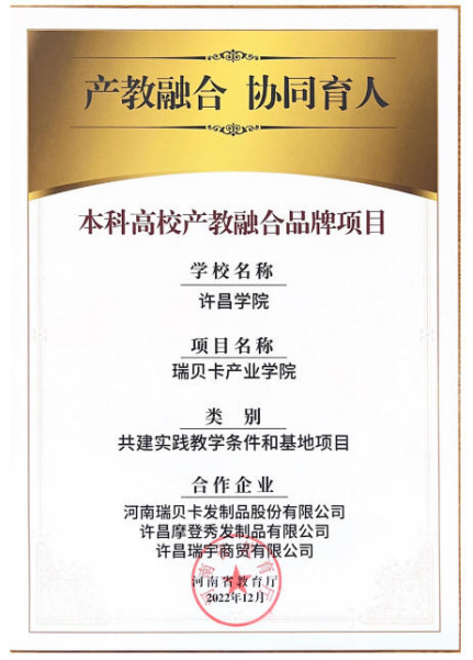 根据河南省教育厅《关于开展本科高等学校产教融合品牌项目推荐工作的通知》(教办高〔2021〕345号)要求,经高校推荐和专家评审,瑞贝卡学院产业学院共建实践教学条件和基地项目,被认定河南省本科高校产教融合品牌项目。