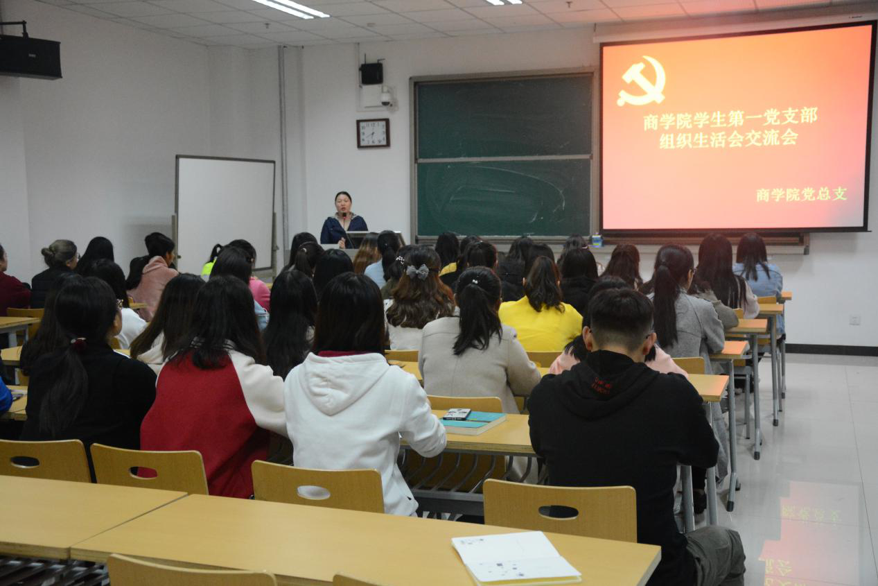 2018年10月23日晚,商学院学生第一党支部于文综楼608教室召开了组织生活交流会,会议由马思杰同学主持,第一党支部书记孔令玲老师到场参加。